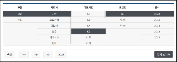 3. 국산차와 수입차 중에서 원하는 중고차를 선택합니다. 이후 제조사, 대표차명, 모델명, 연식 순으로 세부 정보를 차례로 선택합니다. 옵션에 따라 중고차 평균 시세를 알아볼 수 있습니다.
