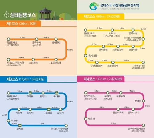 생태탐방 코스는 4가지입니다. 1코스는 가장 쉬운 코스로 고인돌 유적지까지 약 1시간 정도 소요됩니다..